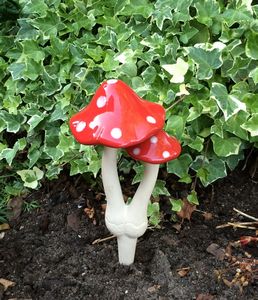 Sød og dekorativ paddehat med 2 klokker. 33 cm høj. den passer i enhver have eller blomsterkrukke. Når det blæser vil de klinge med blide toner. Lavet i vejrbestandigt materiale, men tåler dog ikke frost.