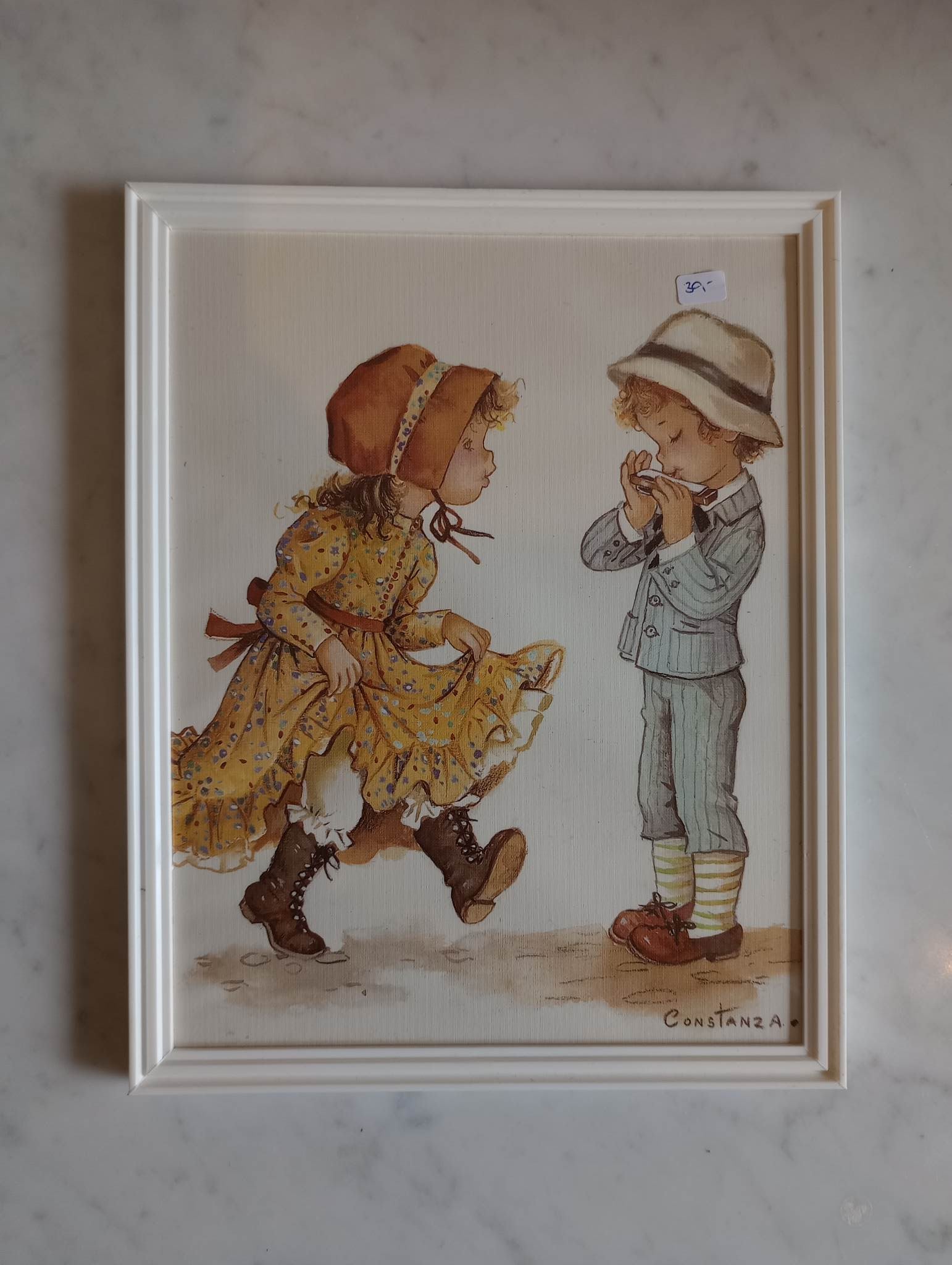 Billede i ramme: Pige danser, dreng spiller mundharmonika
