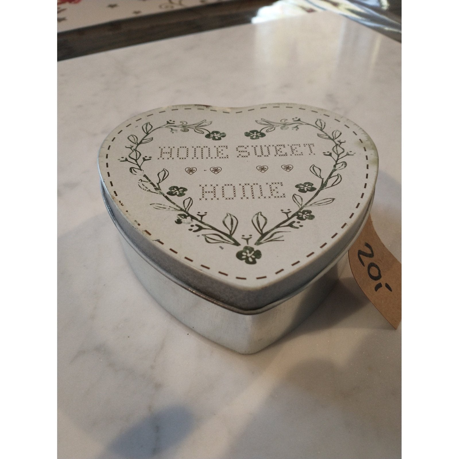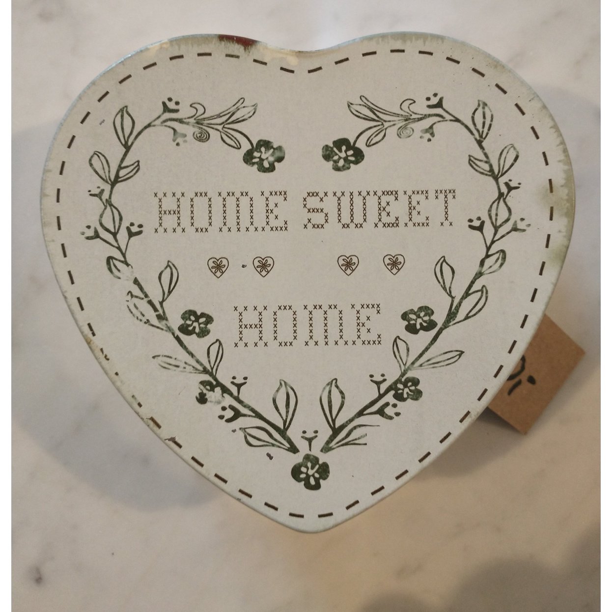 Hjerteformet dåse med teksten "Home Sweet Home" og mønster.