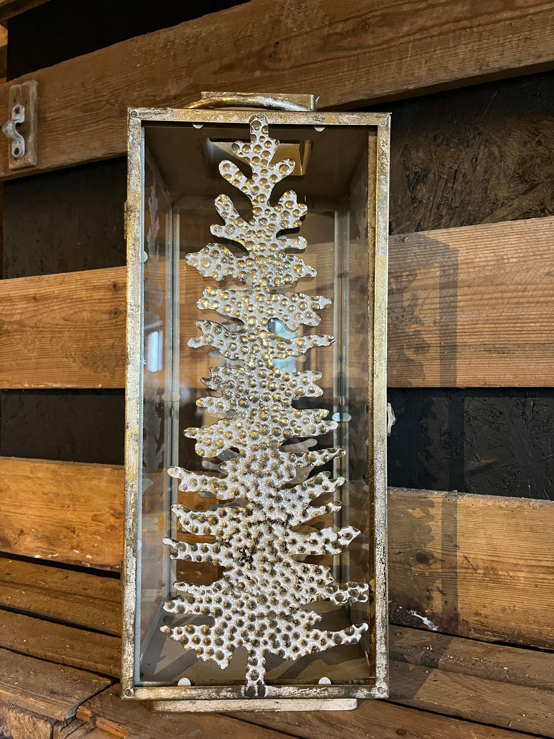 Smuk lanterne i metal med mønster af et træ, som er oplagt til juletiden, lanternen har hank og en smuk antique messing farve.
