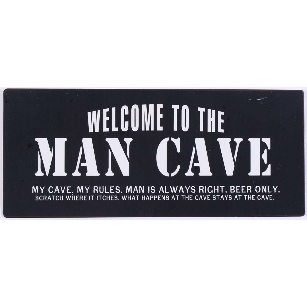Fedt man cave skilt med tesksten: Welcome to the man cave - My cave, my rules, man is always right, beer only, scrath ehere it itches, what happens at the cave stays at the cave.