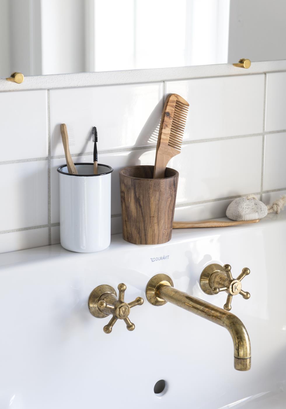 Sødt tandkrus i emalje med mørk kant. Pynter flot på badeværelset.